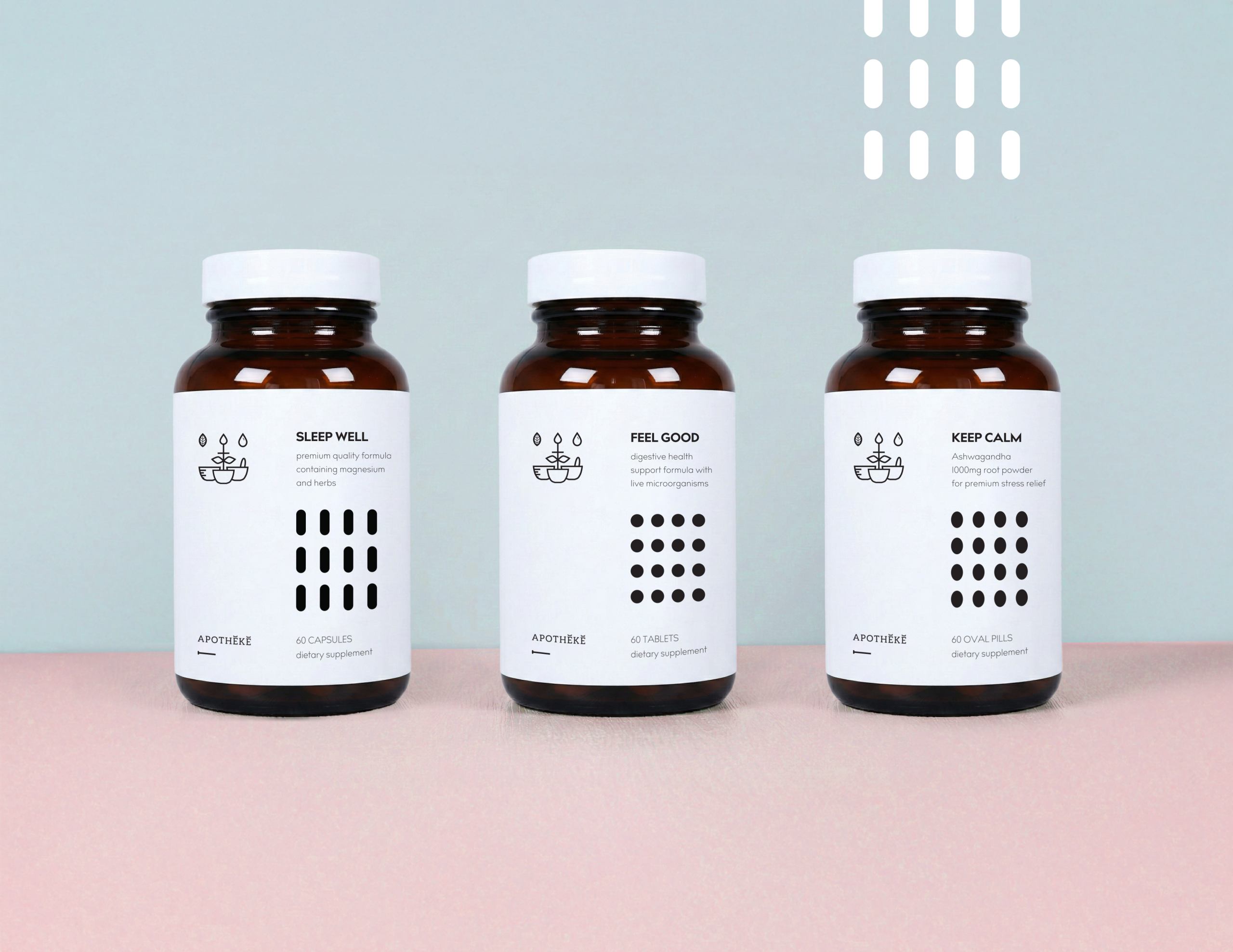The Apothéke supplement line embraces a minimalist and refined approach to branding and packaging design.This series of health products, including Feel Good, Sleep Well, and Keep Calm, supports various wellness goals with carefully formulated supplements.